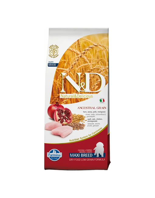 Farro, avena, pollo, melograno. Alimento completo per cuccioli e per cagne in gestazione o in allattamento.